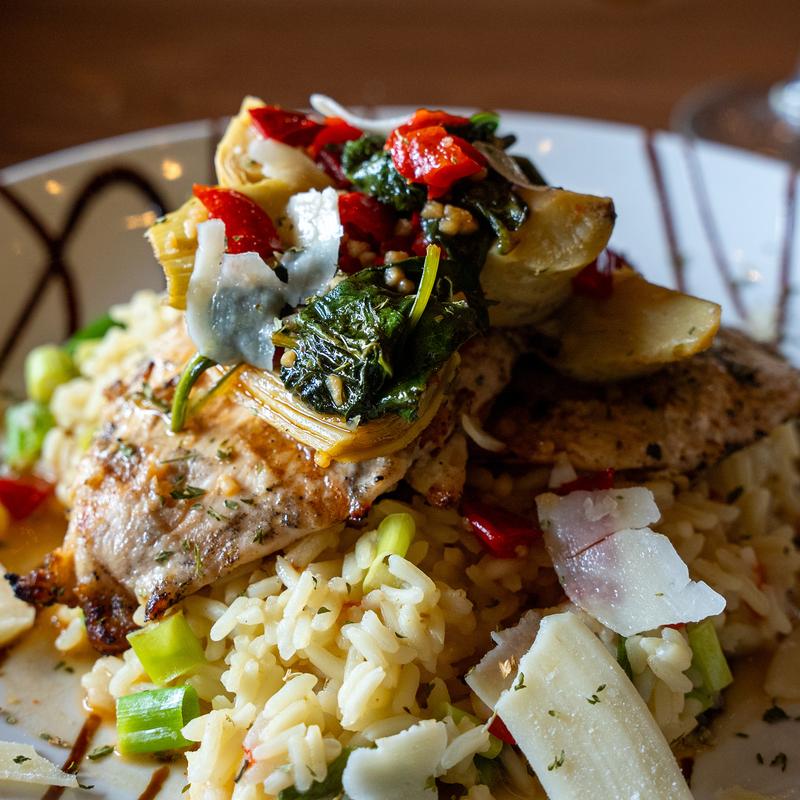 Charbroiled chicken breasts, artichoke hearts, roasted red peppers, baby spinach, white wine garlic butter sauce, parmesan over rice. Served with 2 sides.